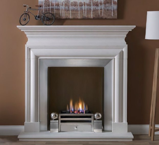 Penman Avellino 57" Agean Limestone Mantel The Avellino, with its sumptuous curves and bold profiles, takes full advantage of the natural beauty of Agean limestone, creating dramatic shadows and higlights. Shown here with the Elan gas fire basket and Sphere dogs, framed by the contrasting lines of a brushed steel plate, it is sure to create a bold statement in any room.