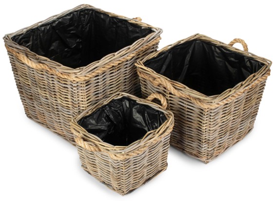 Set of 3 Square Tapered Rope Handled Rattan Planter With Plastic Lining