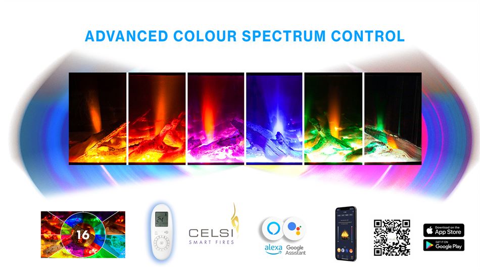 COLOUR Celsi Smart Fires have16 pre-set ambient colour modes, and over 100+ multi colour combinations to customise the light ambience on flames, logs, and ember beds. To simplify your choice you can relax with a slow cycle through the colour spectrum in our fully immersive Animation mode.