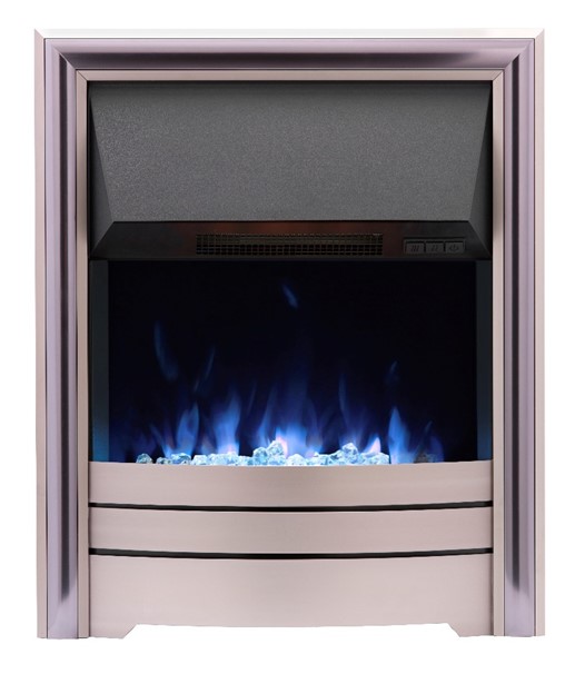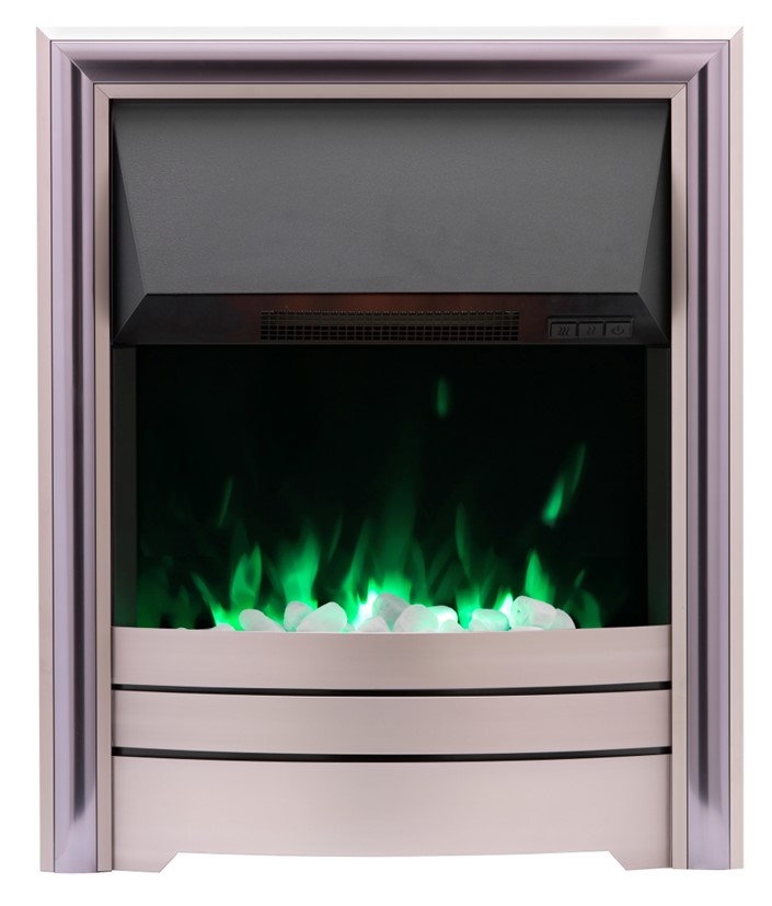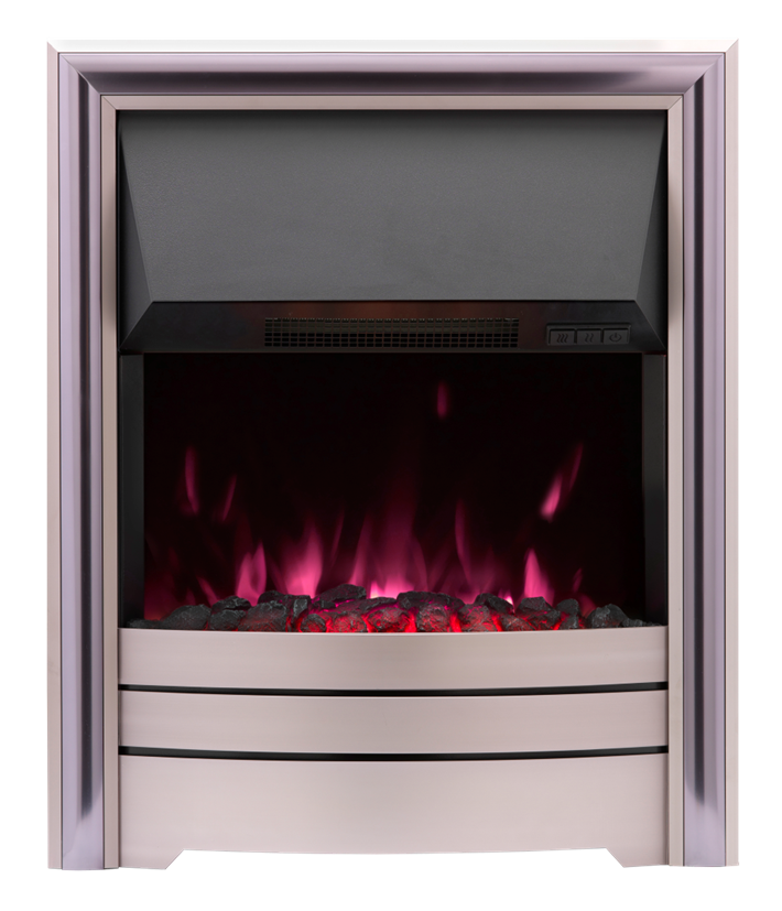 Gallery Collection Remote Control Electric Fire with Sandon with Champagne Frame. The Gallery Collection inset electric fire features our latest innovative multi-colour way flame technology. This versatile appliance has an impressive range of up to 2kW heat output and is available with a range of contemporary and traditional trims to choose from. The appliance comes with 4 interchangeable fuel beds allowing you to swap them as your tastes change. For a more traditional look you can use the coals or logs or for a contemporary feel you can use the pebbles or crystals. The UK designed appliance is fully ERP compliant and is supplied with an infrared remote with LCD display with a friendly interface allowing all the settings available easy to understand and function. The fire has been designed with optimal controllability enabling you to switch quickly and simply from heat to flame effect.