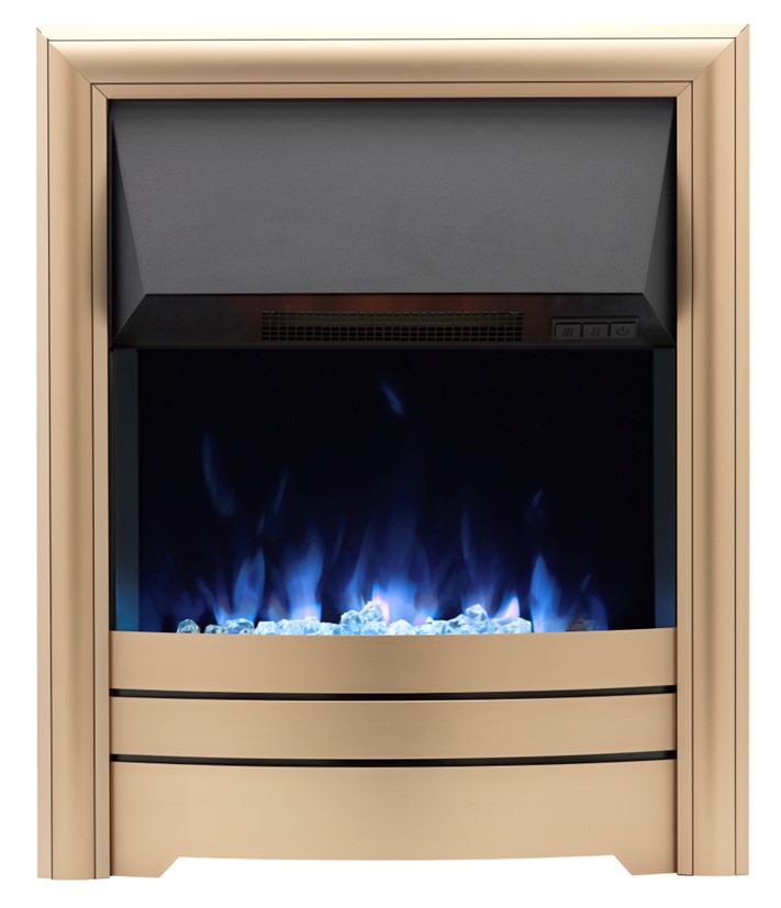 Gallery Collection Remote Control Electric Fire with Sandon with Satin Gold Frame. The Gallery Collection inset electric fire features our latest innovative multi-colour way flame technology. This versatile appliance has an impressive range of up to 2kW heat output and is available with a range of contemporary and traditional trims to choose from. The appliance comes with 4 interchangeable fuel beds allowing you to swap them as your tastes change. For a more traditional look you can use the coals or logs or for a contemporary feel you can use the pebbles or crystals. The UK designed appliance is fully ERP compliant and is supplied with an infrared remote with LCD display with a friendly interface allowing all the settings available easy to understand and function. The fire has been designed with optimal controllability enabling you to switch quickly and simply from heat to flame effect.